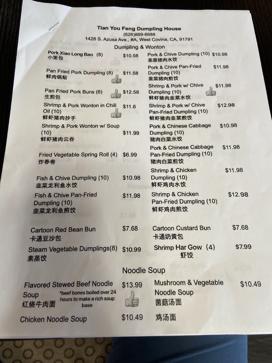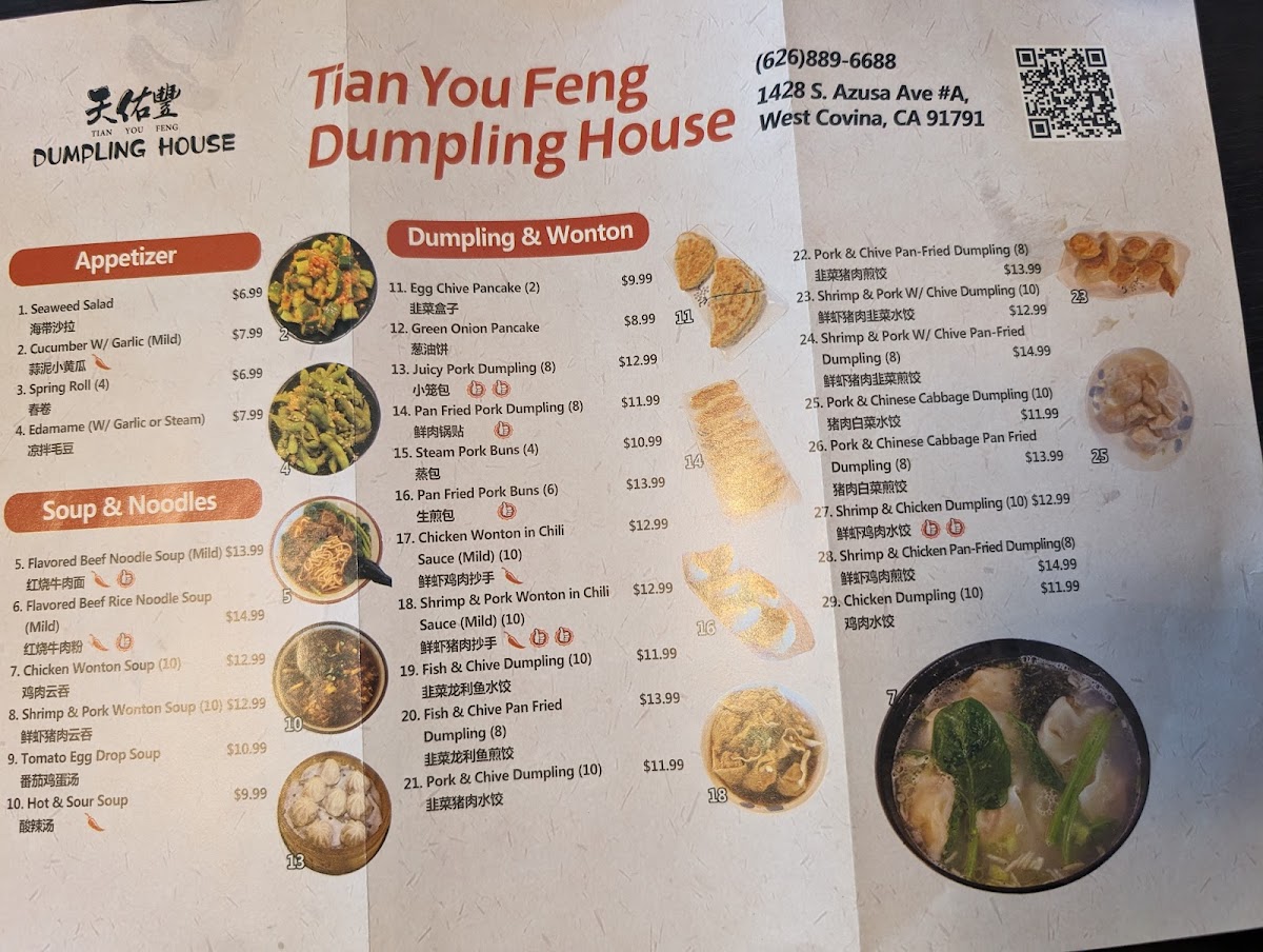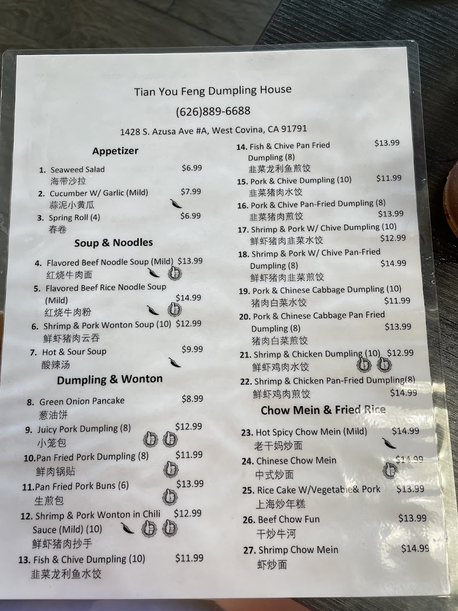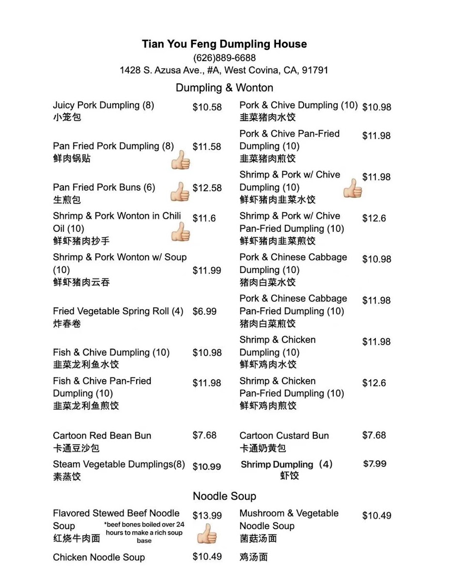 Tian You Feng Dumpling House Menu (Updated October 2025)